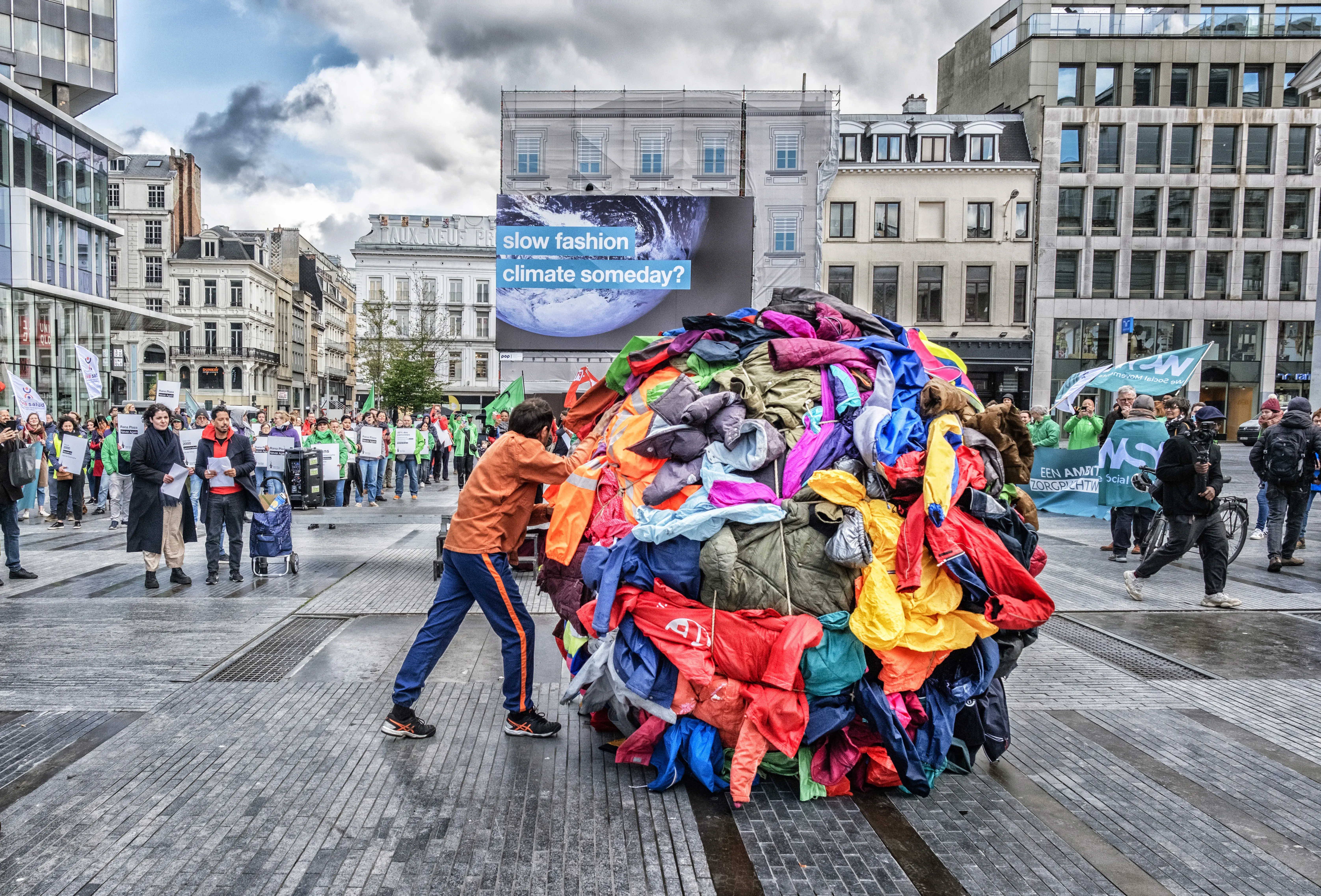 Twaalf jaar na Rana Plaza trokken actievoerders door de Brusselse Nieuwstraat om merken en politiek op te roepen tot dringende actie.